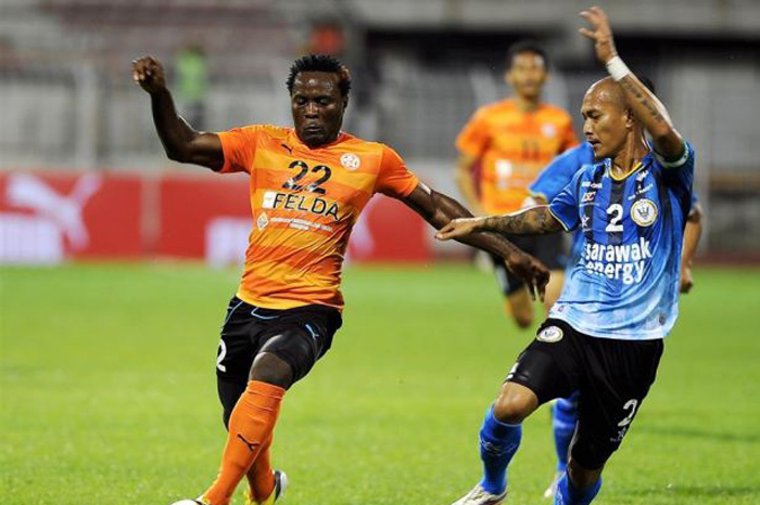 Felda United striker Edward Wilson (left) in action against Sarawak in the