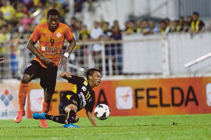 PEMAIN import FELDA United Makeche Ndumba (kiri) mengasak pemain Perak