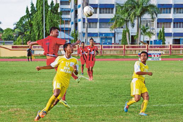 PEMAIN SMK Putera (jersi merah) diasak pemain SSBG pada pertemuan baru-baru ini.
